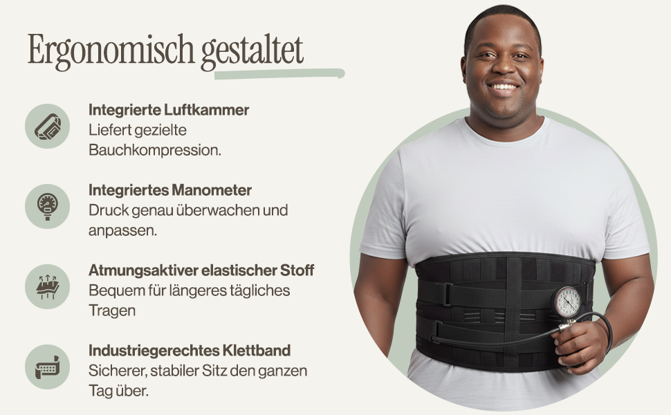 Der Kompressionsdruck wird individuell über ein integriertes Manometer mit Skala eingestellt. Der Gürtel arbeitet rein mechanisch, ohne Elektronik, Medikamente oder invasive Eingriffe. Das verwendete Elastan-Mischgewebe ist atmungsaktiv, hautfreundlich und auf eine stabile, gleichmäßige Druckverteilung ausgelegt.
