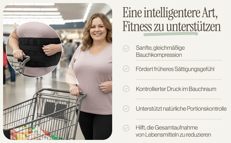 Durch gleichmäßige, ergonomische Kompression im Bauchbereich fördert er ein früheres Sättigungsgefühl und unterstützt die natürliche Reduktion der Nahrungsaufnahme.
